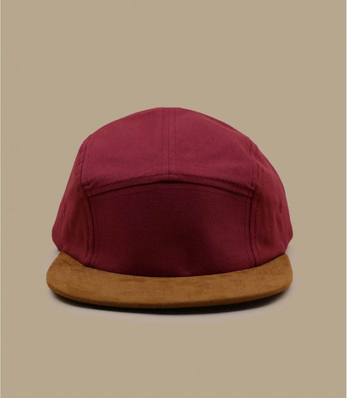 5 Panel bordeaux en coton washed avec visière suede marron. Attache réglable avec clip à l’arrière. Tour de tête 55-60 cm.