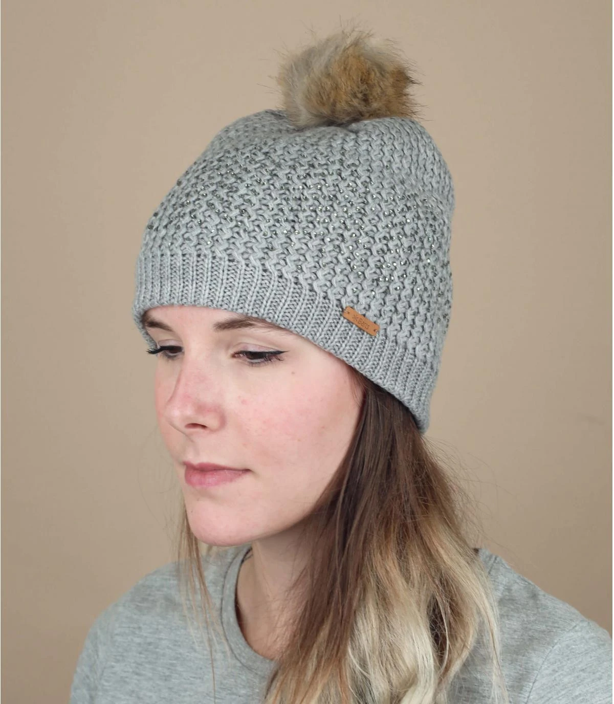 En gris chiné lumineux, ce ravissant bonnet vous donnera une allure très féminine, grâce à ses incrustations scintillantes. Bien chaud puisque sa matière très douce contient 50 % de laine, il est couronné d’un superbe pompon en fausse fourrure très légère.