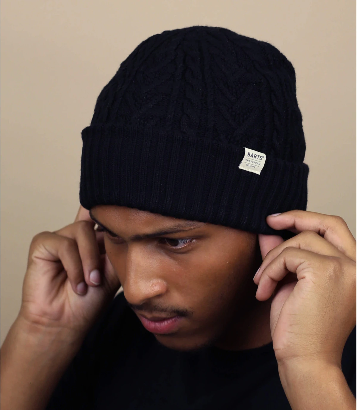 Vous pouvez porter ce bonnet noir chaud et douillet en toute occasion. Il présente un motif de mailles classique. Son revers vous garantit un bon maintien. On retrouve le nom de la marque Barts brodé sur le revers.