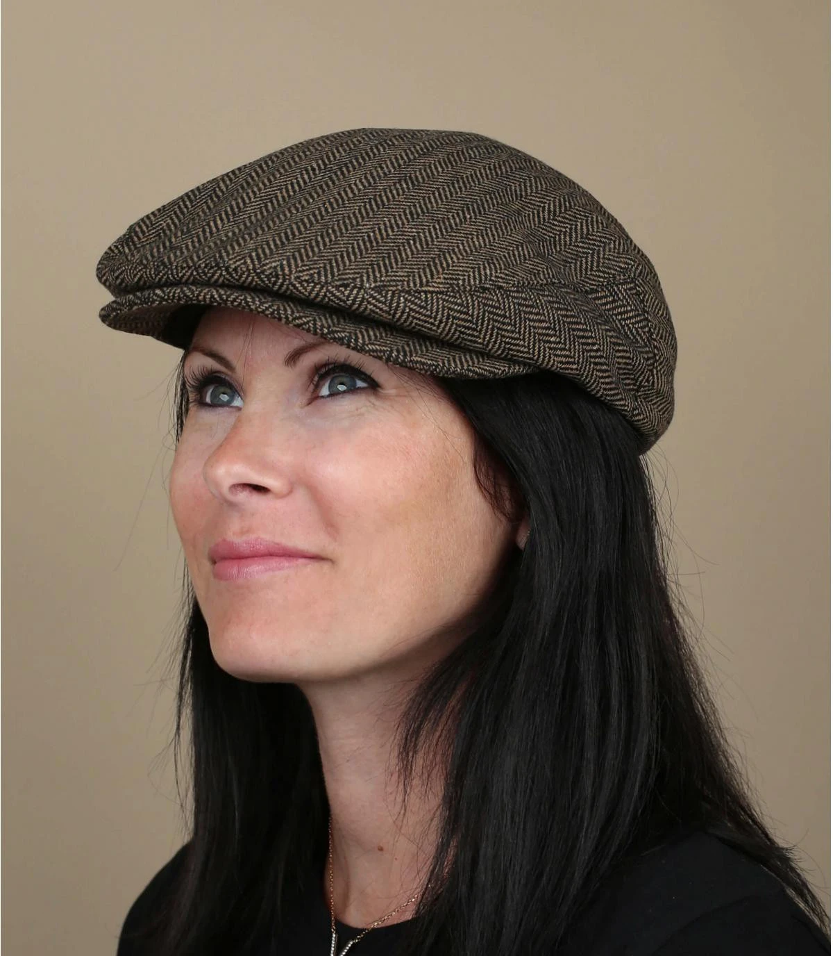 Béret casquette Hooligan pour femme avec visière. Motifs chevrons gris et khaki. Visière cousue à l’ensemble. Logo Brixton cousu sur l’arrière. Doublure 100% polyester de couleur rouge.