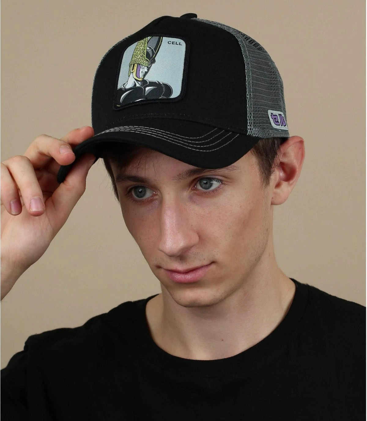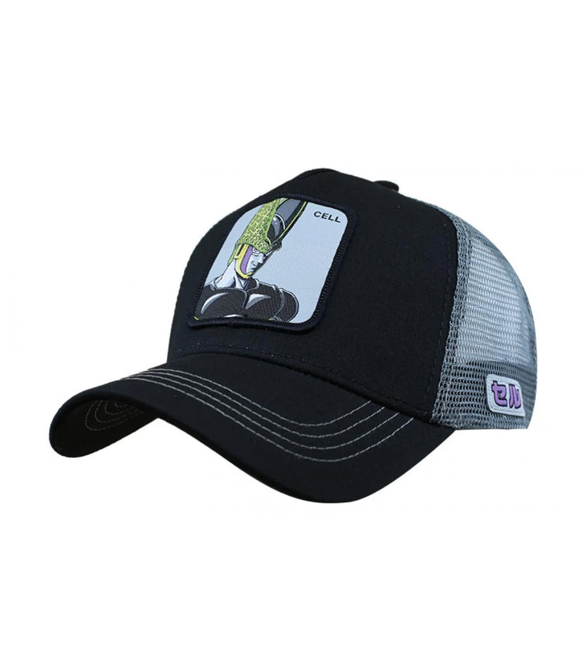 Mêlant des cellules de Son Goku, Vegeta, Piccolo et d’autres, Cell est décidé à devenir le combattant ultime. Cette casquette trucker noire est relevée d’un grand patch à son effigie et d’une étiquette à son nom en caractères japonais sur le côté.