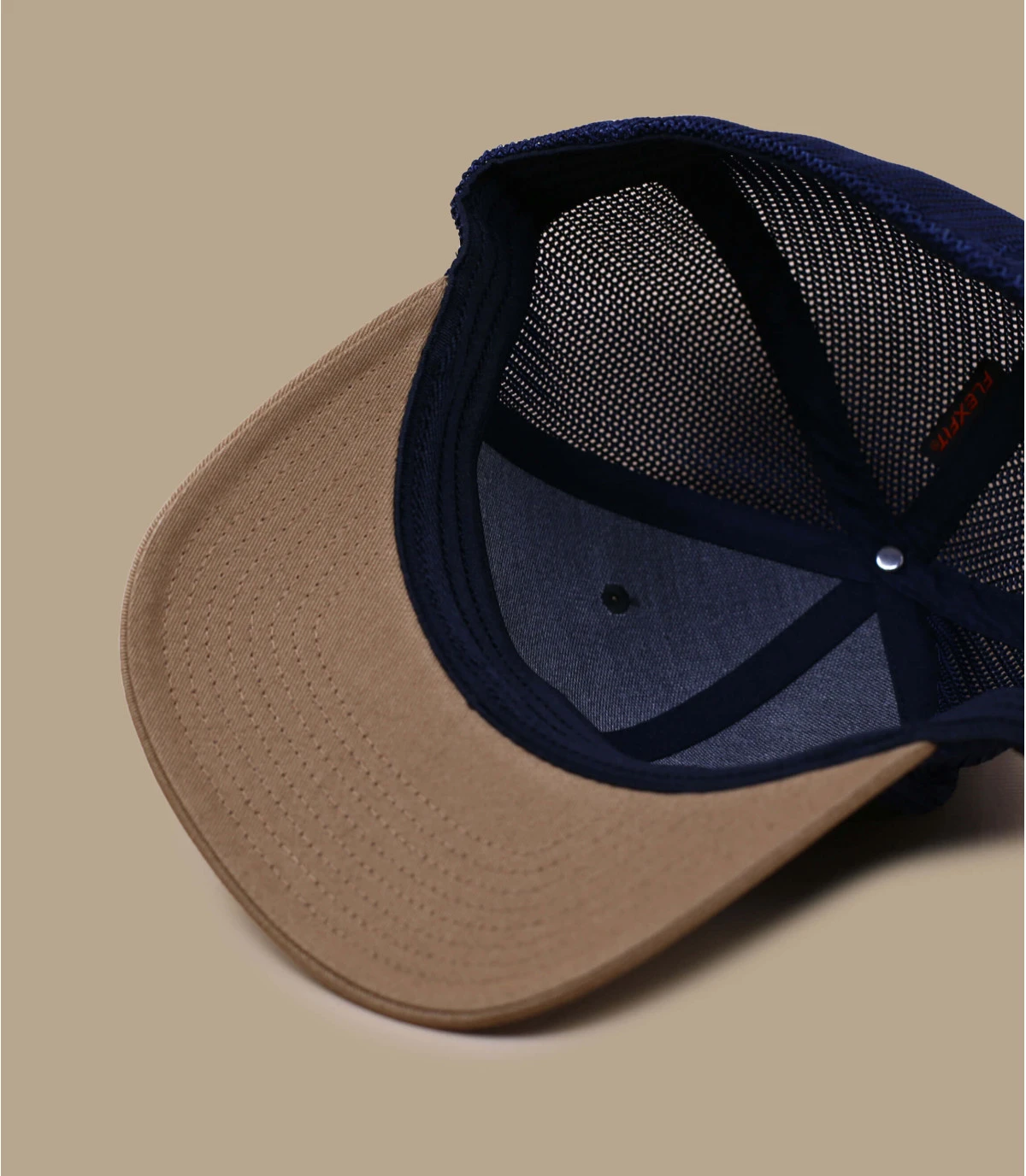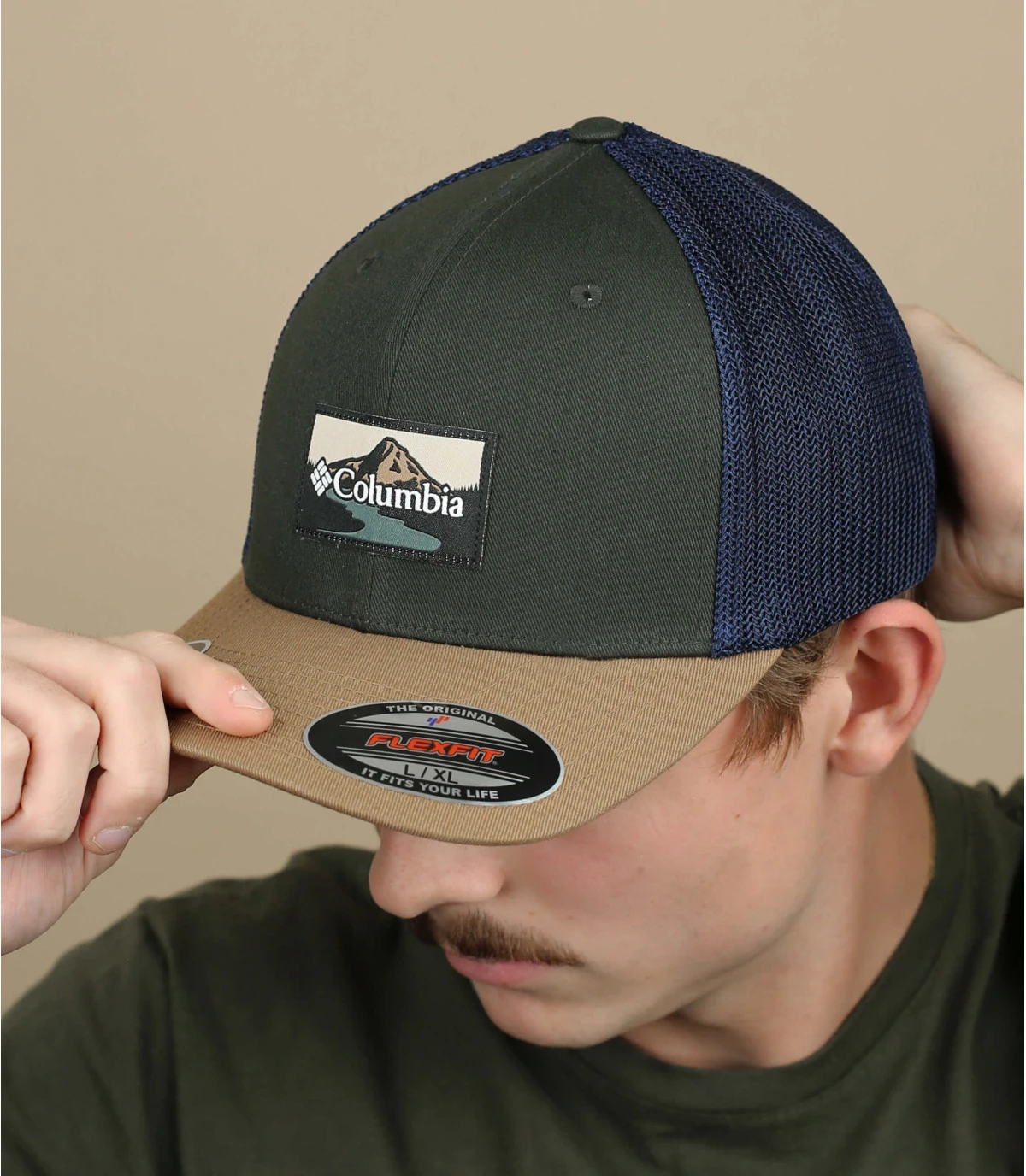Cette casquette trucker est la casquette outdoor par excellence ! L’avant est vert, sa visière marron, et le filet arrière bleu marine. On peut voir un paysage de montagne sur le patch Columbia cousue à l’avant.