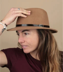 Distinguez-vous, avec cet élégant chapeau en feutre couleur camel, relevé d’un lien de cuir avec une boucle en métal. Il nous est proposé par le spécialiste Fléchet.