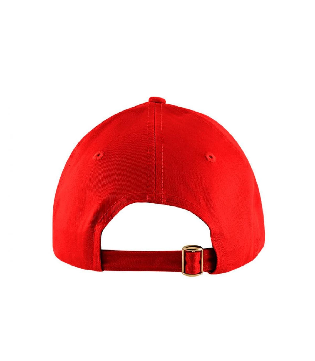 Casquette enfant ajustable rouge à visière courbée. Logo NY brodé de couleur blanc. Autocollant officiel New Era sur la visière et languette de réglage à l’arrière. Logo New Era sur le côté gauche.