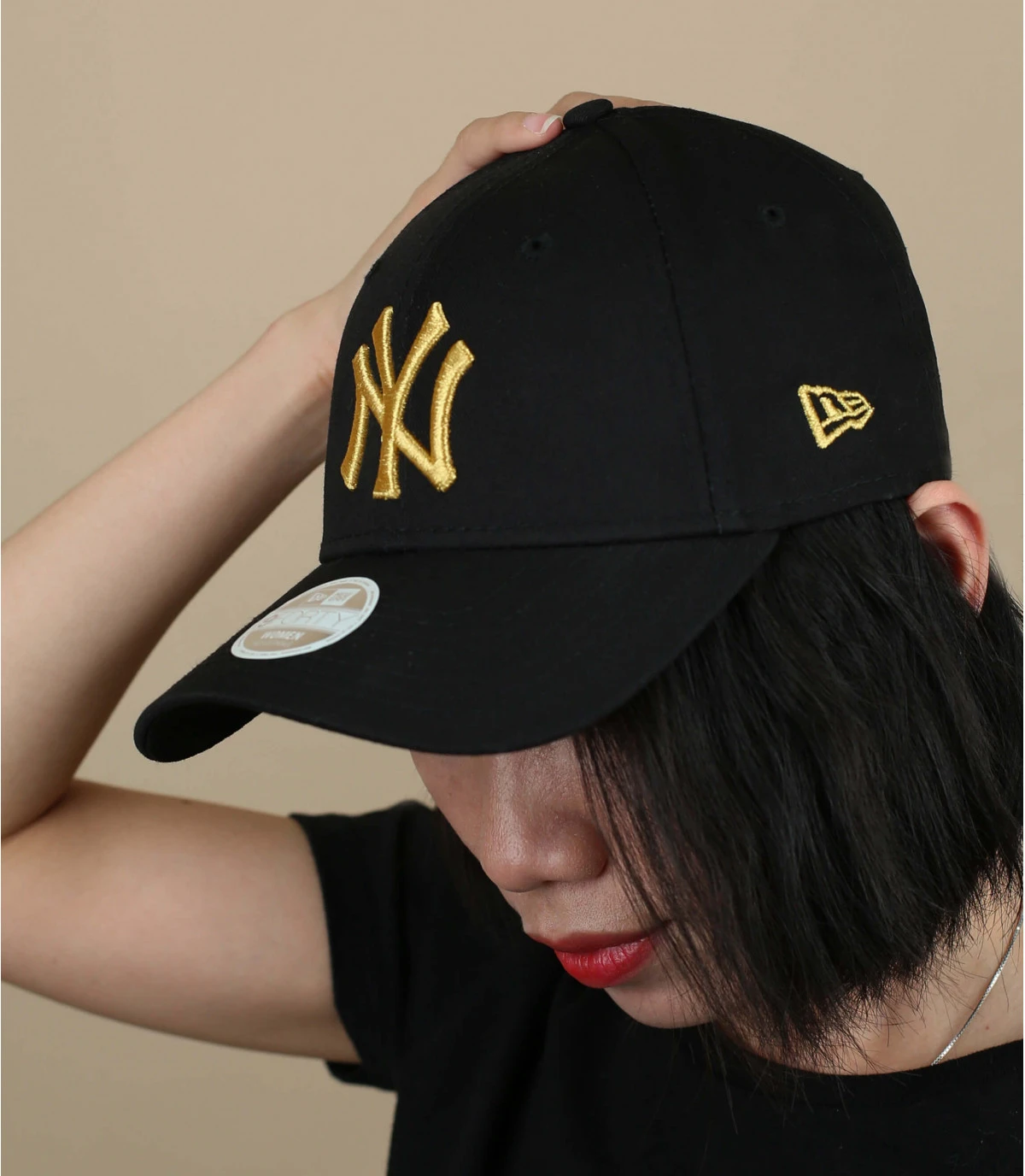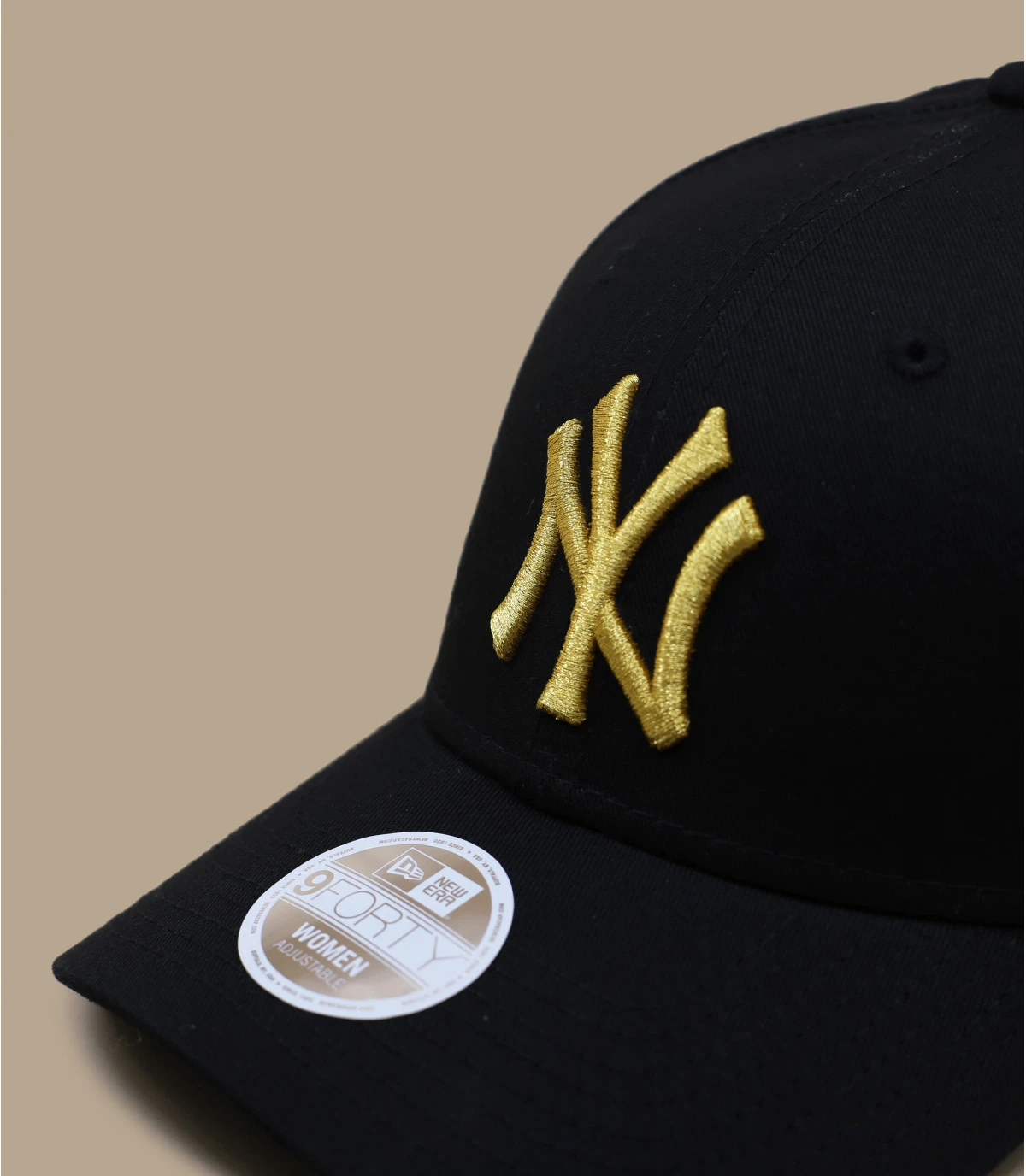 New Era a crée une collection de casquette pour femme tout en gardant sa patte inimitable. Sur ce modèle noir à visière curve, les initiales NY sont brodées en couleur or pour un contraste détonant.