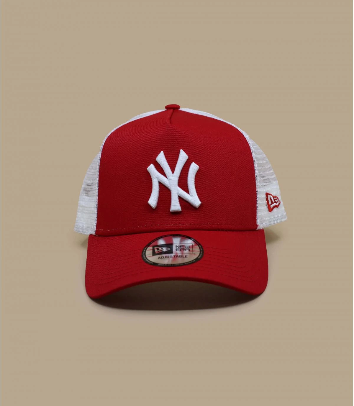 Casquette Trucker NY rouge à visière courbée. Filet blanc et languette de réglage à l’arrière. Avant rouge en mousse. Maxi logo NY brodé en blanc. Autocollant officiel sur la visière.