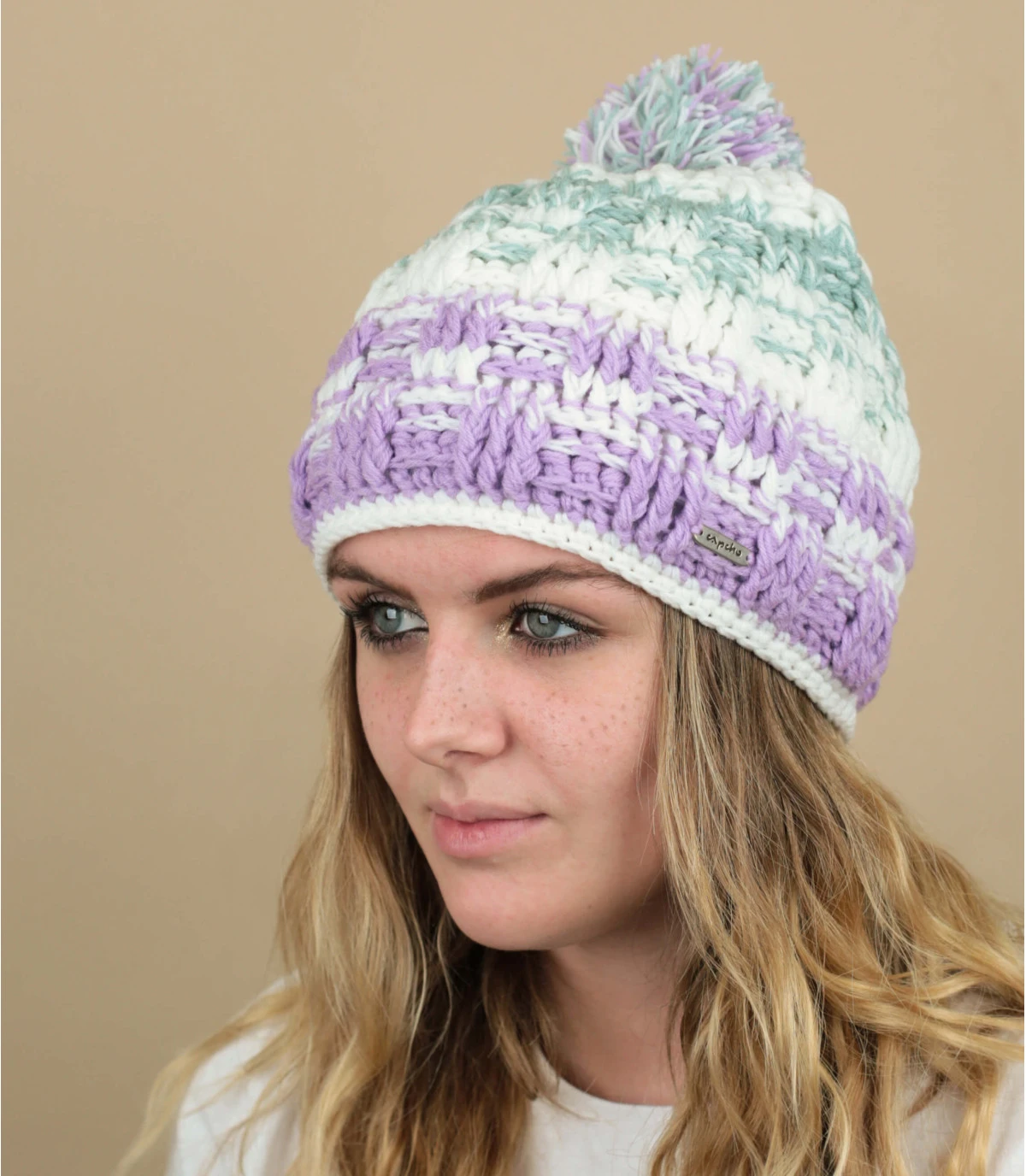 La marque Capcho s’inspire de la culture népalaise avec des couleurs vibrantes. Ce modèle à pompon violet et gris tricoté à la main est chaud et confortable. Il est tendance à la ville comme en pleine nature.