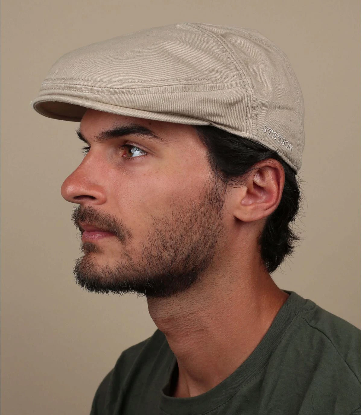 Béret Paradise avec visière cousue sur l’avant. Béret de couleur beige avec large pan vertical sur l’avant et broderie Stetson sur le côté gauche. Protection anti UV UPF+40.