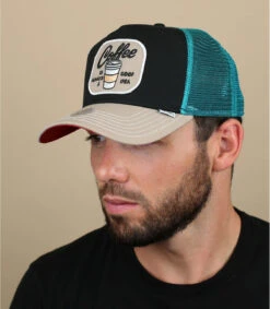 Portez une casquette qui donne de l’énergie grâce à son style et son imprimé fun ! Le front de cette casquette trucker est noir, son filet arrière est turquoise, sa visière est beige. On peut voir à l’avant un dessin de café avec le mot Coffee.
